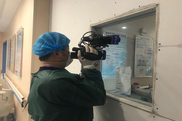 (中新社视频新闻部记者孙恒业在同济医院光谷院区ICU病房外采访)