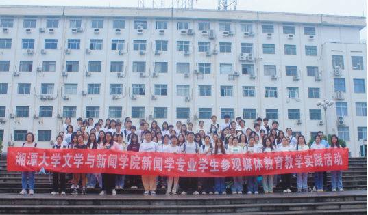 上午八点,2023级新闻学专业学生在第三教学楼合影留念,分班级、分批次抵达湘潭日报社进行参观学习。