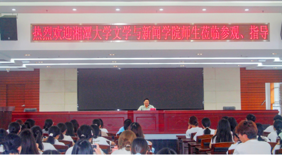 活动伊始,由湘潭日报社总编办赵成锋主任主持开展座谈会。赵成锋主任首先对全体学生的到来表达了热切的欢迎。座谈会中,赵成锋主任通过对湘潭日报社的总体情况、重大事件报道、全媒体融合发展、典型案例分析四个方面进行详细讲解。湘潭日报社致力于媒介融合,创办全融媒体中心,构建全方位、多层次、宽领域的媒介融合模式,紧跟时事热点,多端发力,使湘潭声音立体化,打造全媒体传播。赵成锋主任以专业的理论知识和详细的案例介绍,引导全体学生积极融入。此次座谈会丰富了学生的理论知识和实战经验,增加了关于媒介融合的理解和认识,同时,也对全体学生的实践方向提供了借鉴意义。