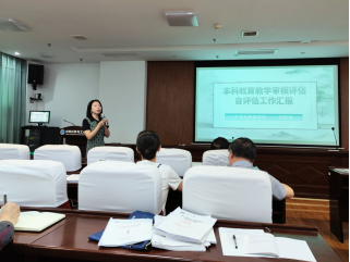 检查指导,副院长刘晓丽代表学院汇报审核评估自评工作情况。刘晓丽从学院历史沿革,学科专业布局与发展,师资力量、学生规模,教学平台建设等方面汇报了学院基本情况,并详细介绍了男同网