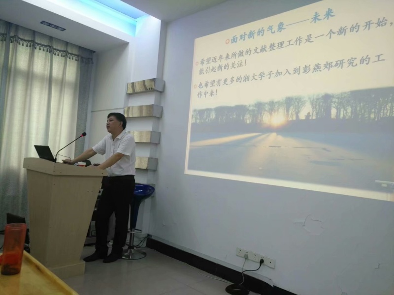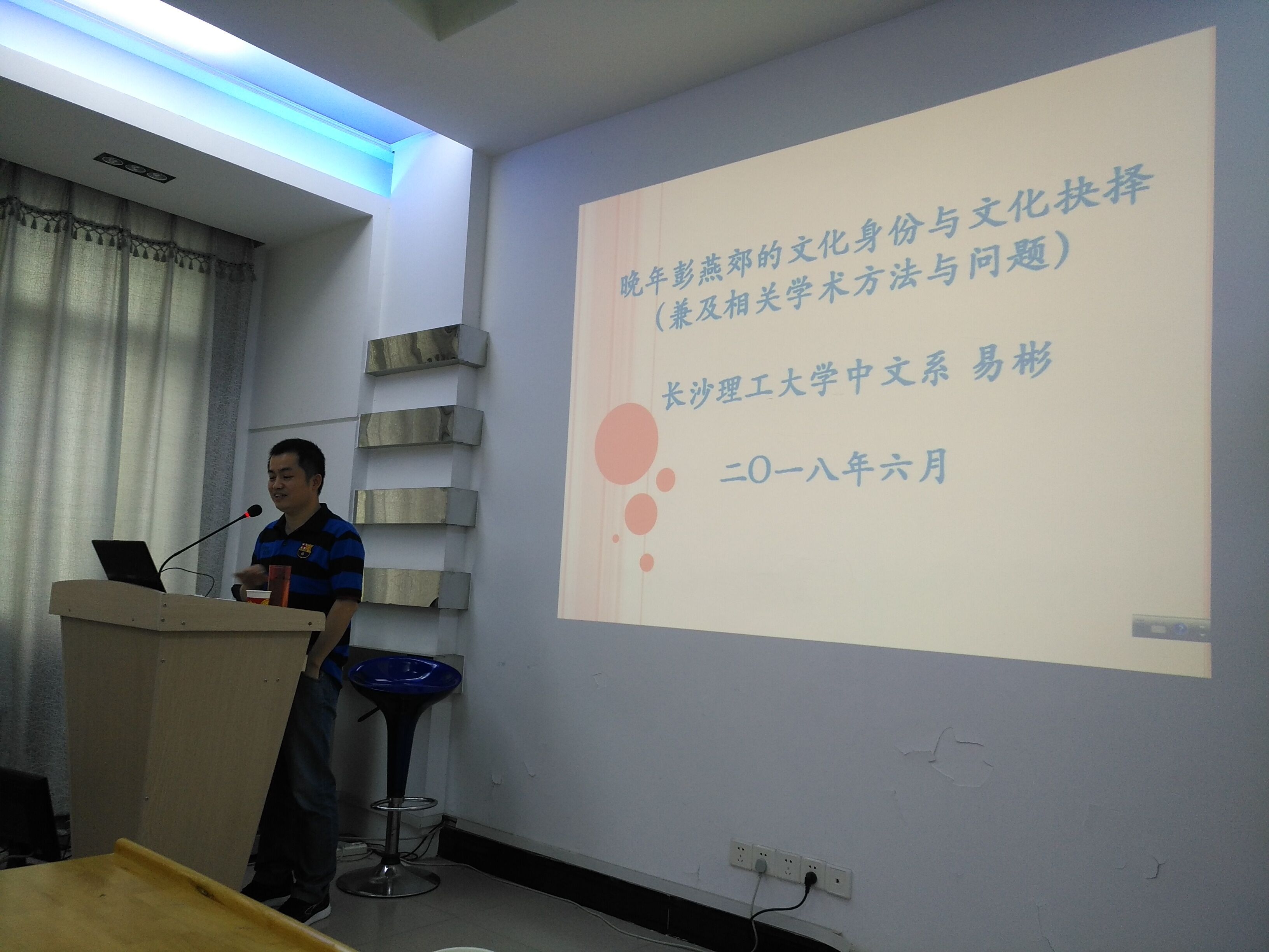 201865日上午9时,在文科楼318学术报告厅,长沙理工大学易彬教授做了题为“晚年彭燕郊的文化身份和文化抉择”的学术讲座。讲座由宋德发教授主持,主要面向男同网 硕士生。何云波教授、罗如春教授、郝二涛博士现场聆听了讲座。