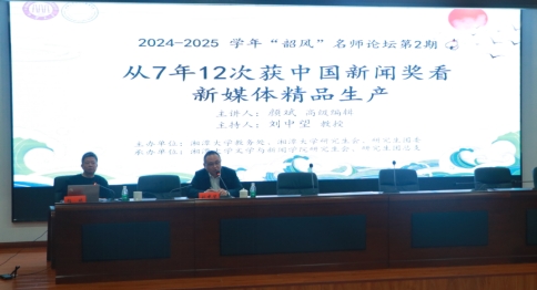 法学院西附楼报告厅内座无虚席。湖南日报社党组成员、社务委员、副总编辑颜斌的专题演讲《从7年12次获中国新闻奖看新媒体精品生产》,让在场200余名新闻学子见证了一场传统媒体破茧成蝶的实战课。当大屏幕上滚动播放着《十八洞的19张微笑》《手机里的小康社会》等获奖作品时,后排站立的同学甚至举起手机拍摄PPT上的“新闻密码”。