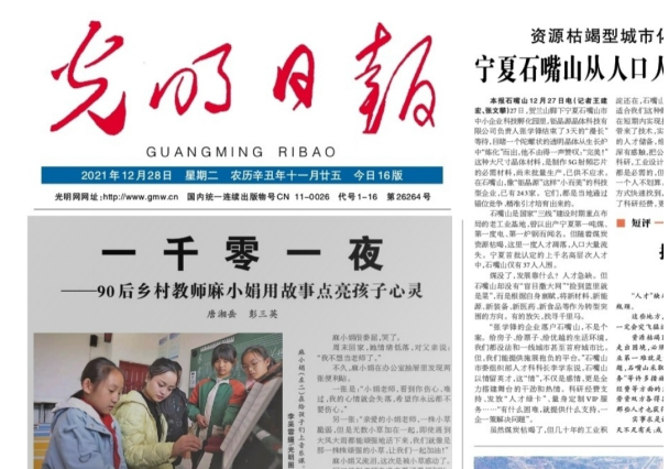 《光明日报》2021年12月28日01版发表了题为《一千零一夜——90后乡村教师麻小娟用故事点亮孩子心灵》的文章,男同网