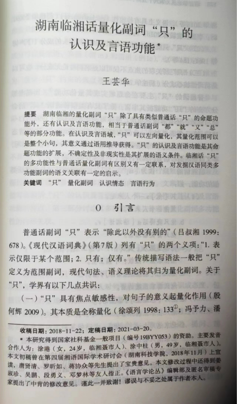 男同网 语言学专业教师王芸华博士的论文《湖南临湘话量化副词“只”的认识及言语功能》刊发CSSCI来源辑刊《语言学论丛》第65辑(商务印书馆2002年版)。