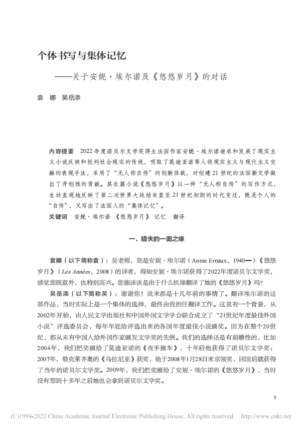 文章认为,安妮·埃尔诺继承和发展了现实主义小说反映和批判社会现实的传统,吸取了莫迪亚诺等人将现实主义与现代主义交融的表现手法,采用了“无人称自传”的创新体裁,对创建21世纪的法国新文学做出了开创性的贡献。《悠悠岁月》生动直观地反映了第二次世界大战结束直至21世纪初期的时代变迁,既是个人的“自传”,又写出了法国人的“集体记忆”。