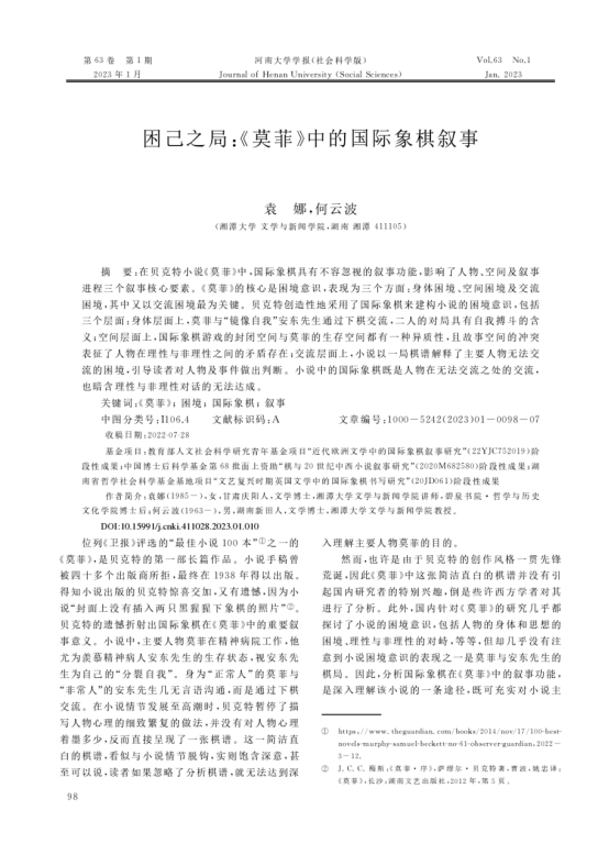 教师袁娜博士与何云波教授合著的论文《困己之局:<莫菲>中的国际象棋叙事》刊载《河南大学学报(社会科学版)》(CSSCI)2023年第1期。