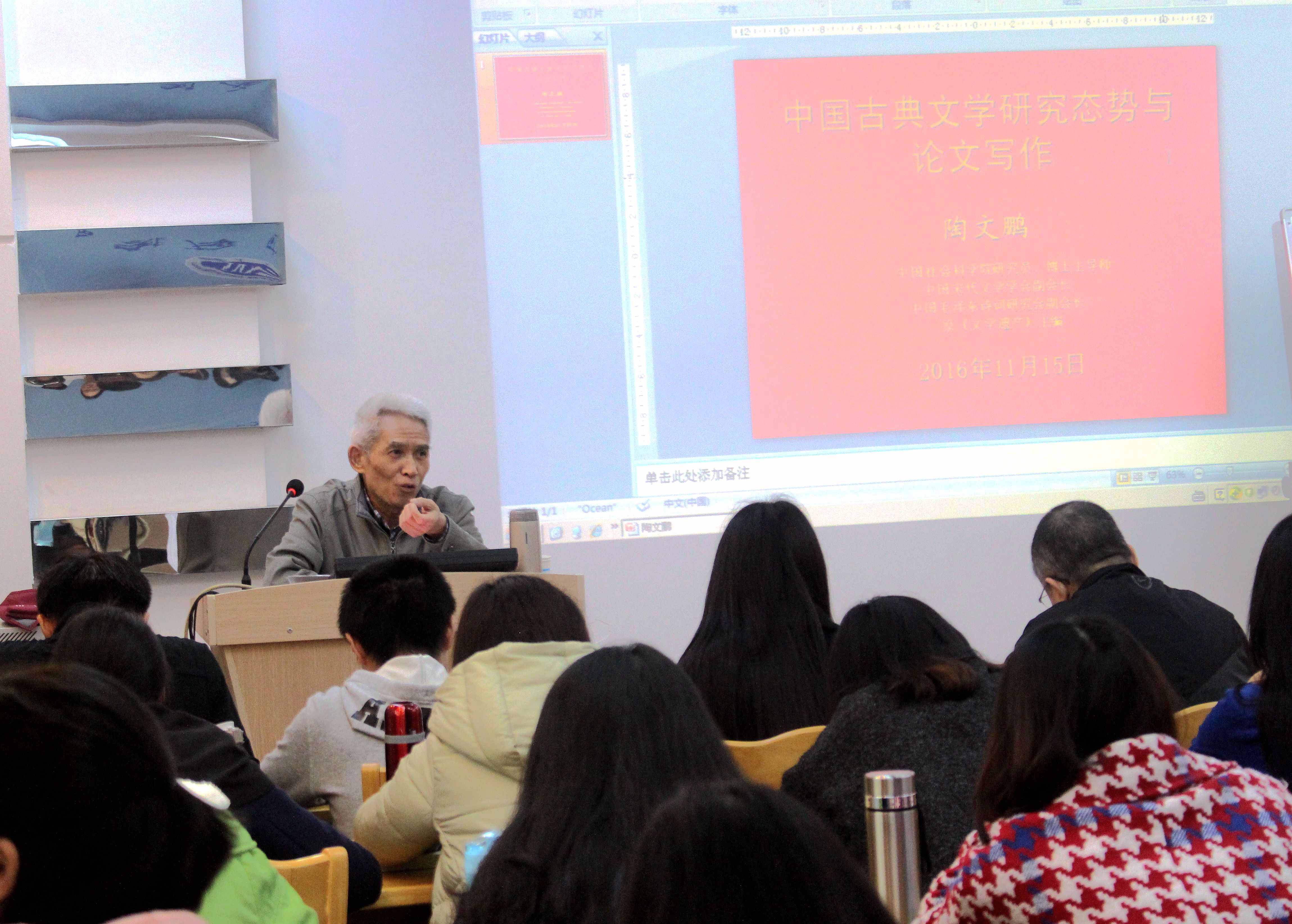 中国古代文学专业的老师和研究生为主的听众座谈古代文学的研究态势及论文的写作问题。陶先生认为,研究中国古代文学,要注意国家领导人关于哲学社会科学的讲话,具有一定的时代性,同时,也必须注意回归经典,回归文学。近年来,家族与文学、宗教与文学、党争与文学、贬谪与文学、民俗与文学、艺术与文学以及地域文学、女性文学等都受到了研究者的广泛关注,多有创获,而文体学、民国文学的研究更是方兴未艾,是值得下大力气去开拓的热点领域。在论文选题方面,首先要有广阔的学术视野,其次要注意反向思维,注意中观论题,注意借鉴别人的优秀题目,做到小中见大,以小求深,找到新角度。在具体写作中,要注意比较的方法,有诗性的思维,追求义理、考据、辞章三者的结合,不要把论文写成综述体、电脑体、讲义体。陶先生的讲述持续了近两个小时,在随后的交流互动环节,他又详细回答了多名同学提出的问题,并鼓励读研的同学要把写一篇好论文当成自己读研期间的“小目标”。