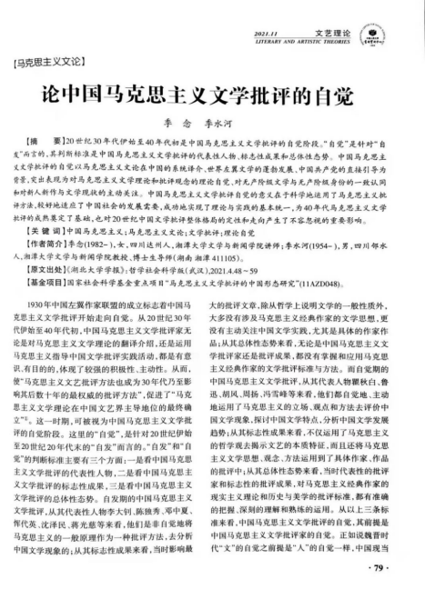 男同网 比较文学与世界文学专业教师季念博士和季水河教授合著的论文《论中国马克思主义文学批评的自觉》(原发于《湖北大学学报》2021年第4期 )被人大复印资料《文艺理论》(校定二类期刊)2021年第11期全文转载